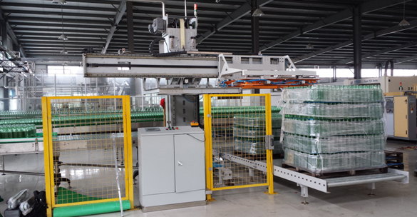 該設(shè)備用于將成垛的空玻璃瓶,拆垛后,輸送至自動(dòng)流水灌裝線輸送帶上。此機(jī)型適用于10000-18000瓶/小時(shí)的生產(chǎn)速度。